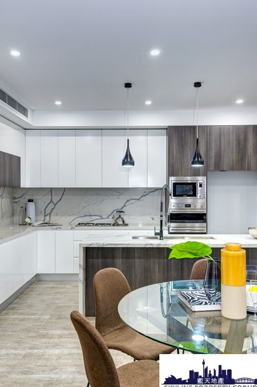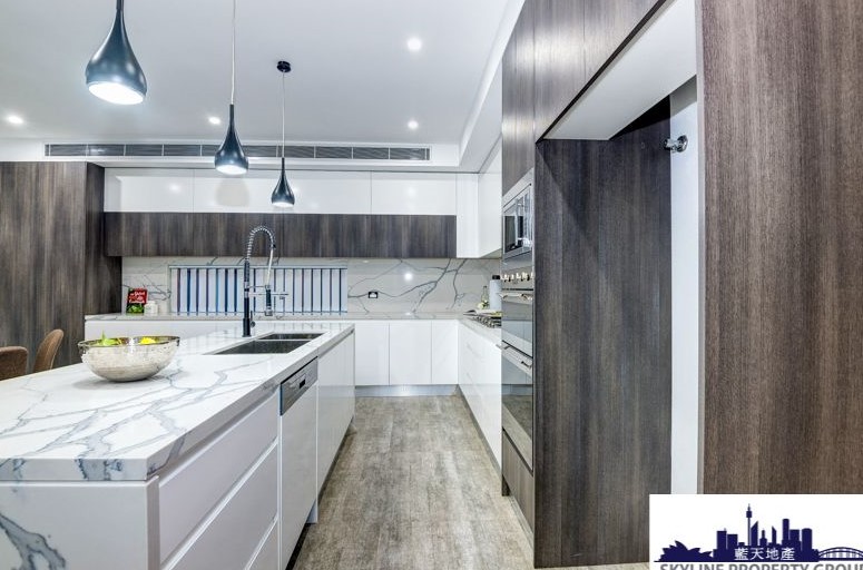 – Large kitchen with 40mm Calacutta stone bench tops and stone splash backs