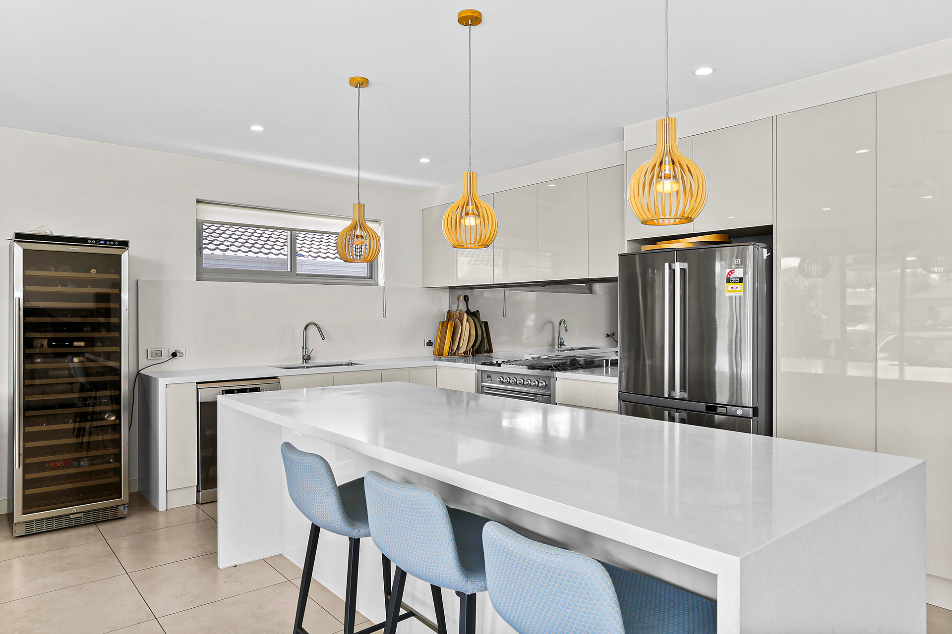 The heart of the home is the entertainer’s kitchen – featuring a solid island bench with waterfall edges, 40mm stone benchtops, and premium Smeg appliances, perfectly designed for hosting and everyday family living.