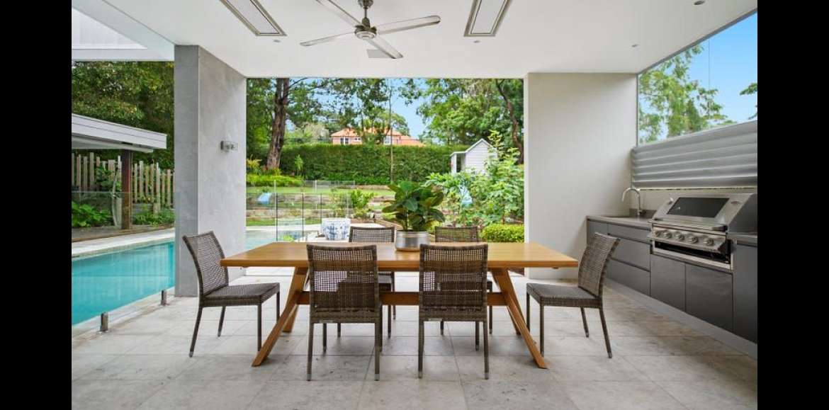 Covered outdoor entertaining with limestone flagging and a full BBQ kitchen with Vintec wine fridge, set in lush landscaped gardens with sandstone accents, auto irrigation, level lawn for play and charming cubby