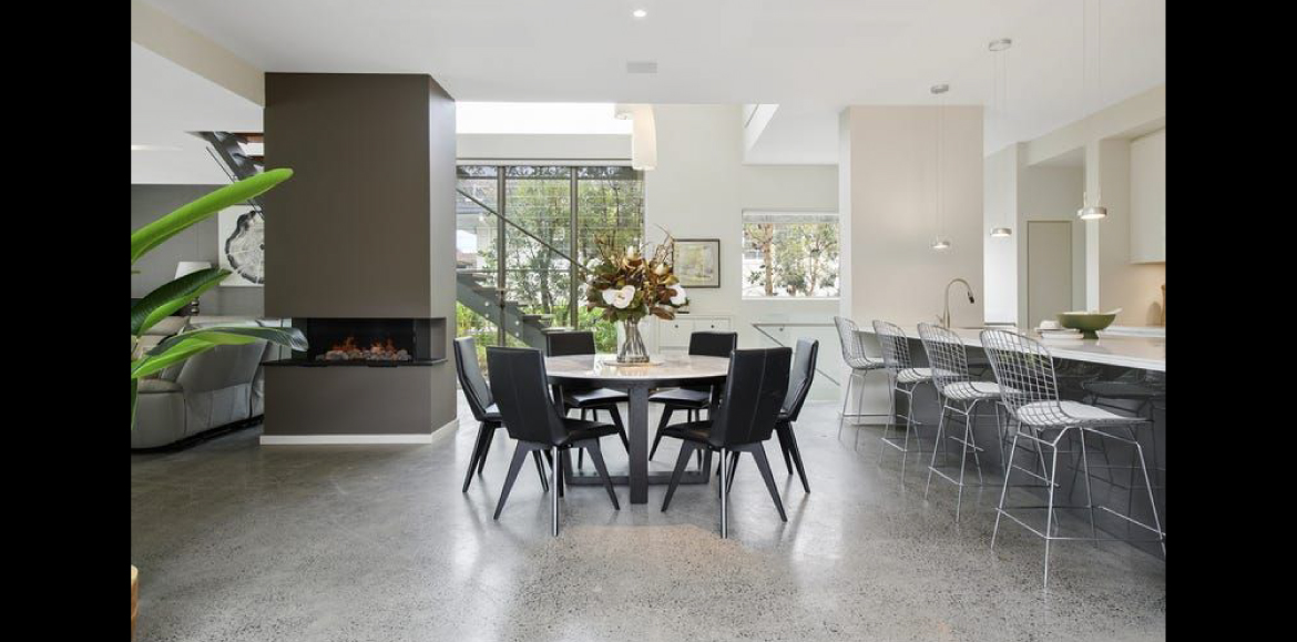 Vast open plan living and dining area with seamless outdoor flow, built in joinery and speakers, contemporary gas flame fireplace, beautiful open-tread staircase