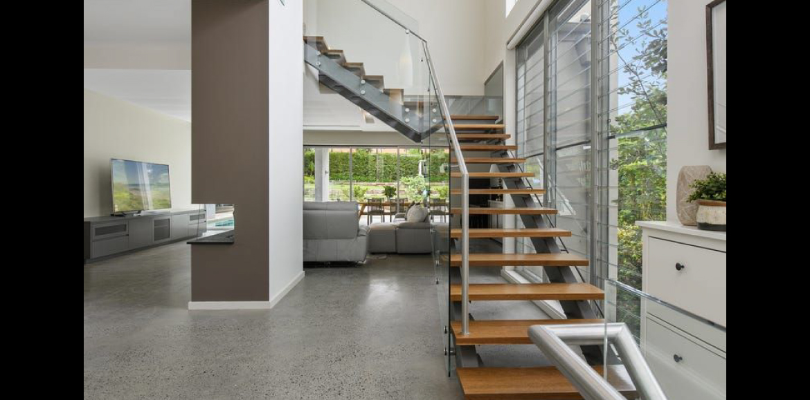 Double height entry introducing polished concrete floors with underfloor heating flowing through the main level