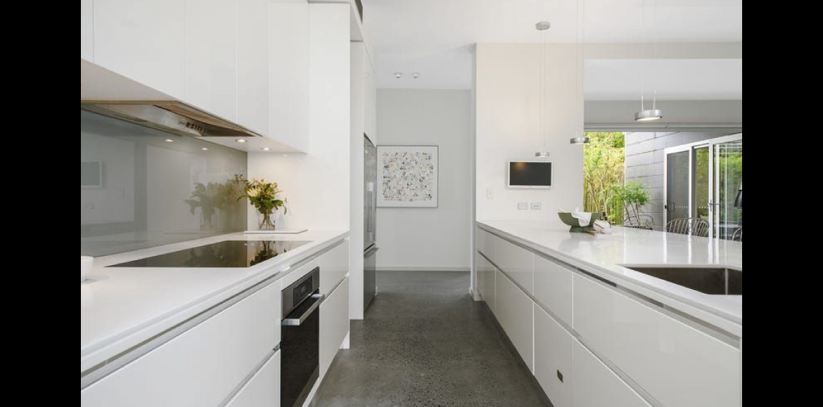 Sleek Hanex kitchen with bold servery breakfast bar and a handy butler’s kitchen, Miele appliances, induction cooktop, two ovens, warming drawer, microwave, two dishwashers, Qasair rangehood